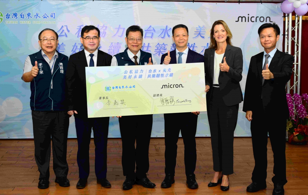 台水公司與美光於12日舉行捐贈協議書簽署儀式,由台水公司董事長李嘉榮率領團隊,與美光全球環安衛及永續副總裁Elizabeth Elroy、台灣美光前段晶圓製造暨營運副總裁鍾聯彬共同出席,並在經濟部副司長劉起孝及台中市政府副秘書長林育鴻的見證下,公開簽署合作協議,展現企業社會責任與公共價值兼具的合作典範。
