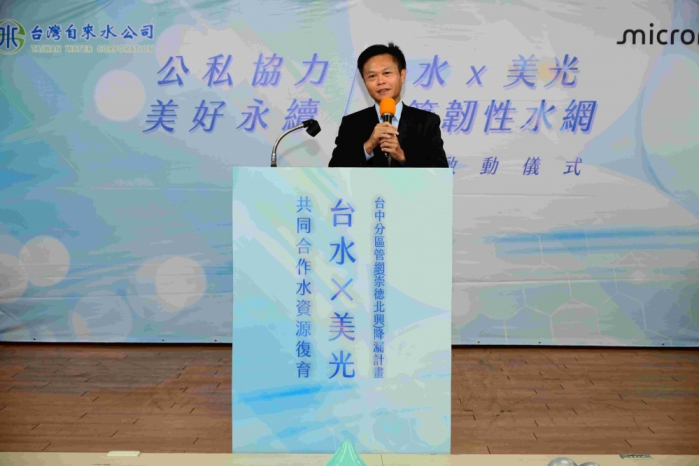 台水董事長李嘉榮指出,台中市漏水率13%,高於全國平均11%,其中,北屯區進化北路崇德路和太原路一段的小區域,管線五公里,每天供水量七千四百多噸,售水量只有一千兩百四十五噸,等於一天流失六千多噸自來水,漏水率達83%。感謝美光捐贈4710萬元,支持台水推動崇德地區老舊管線更新,預計明年底完成,售水率可望提升至九成。