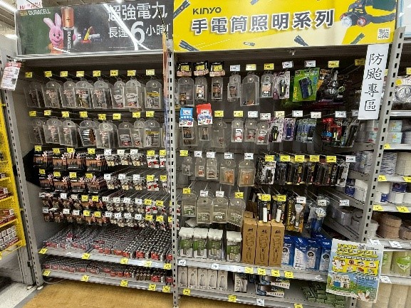 目前各大賣場防災專區,常見防災必備品包含手電筒與備用電池、瓶裝水與即食食品、急救包、防水布與膠帶、哨子與求生口哨等,民眾平時可主動備妥防災用品,並放置於家中明顯易取處。