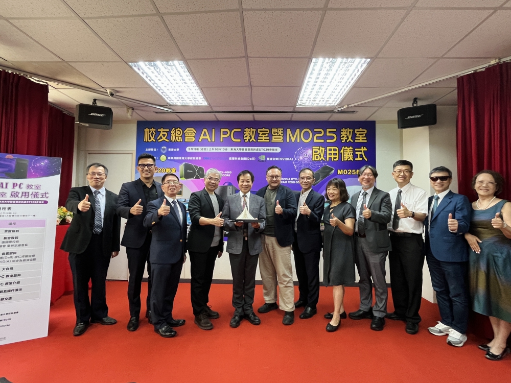 9月18日,東海大學於圖書資訊處舉辦「AI PC教室暨M025教室啟用儀式」,台中市副市長鄭照新、校友總會葉世宗總會長、李基正輔導總會長、邱媛美校友楷模委員會主委、董事會陳允恭監察人等皆蒞臨,並與產業夥伴戴爾科技集團廖仁祥總經理、NVIDIA台灣區邾亦為資深協理在張國恩校長與校內主管陪同下,產學與校友三方攜手,為東海AI教育開啟新篇章。
