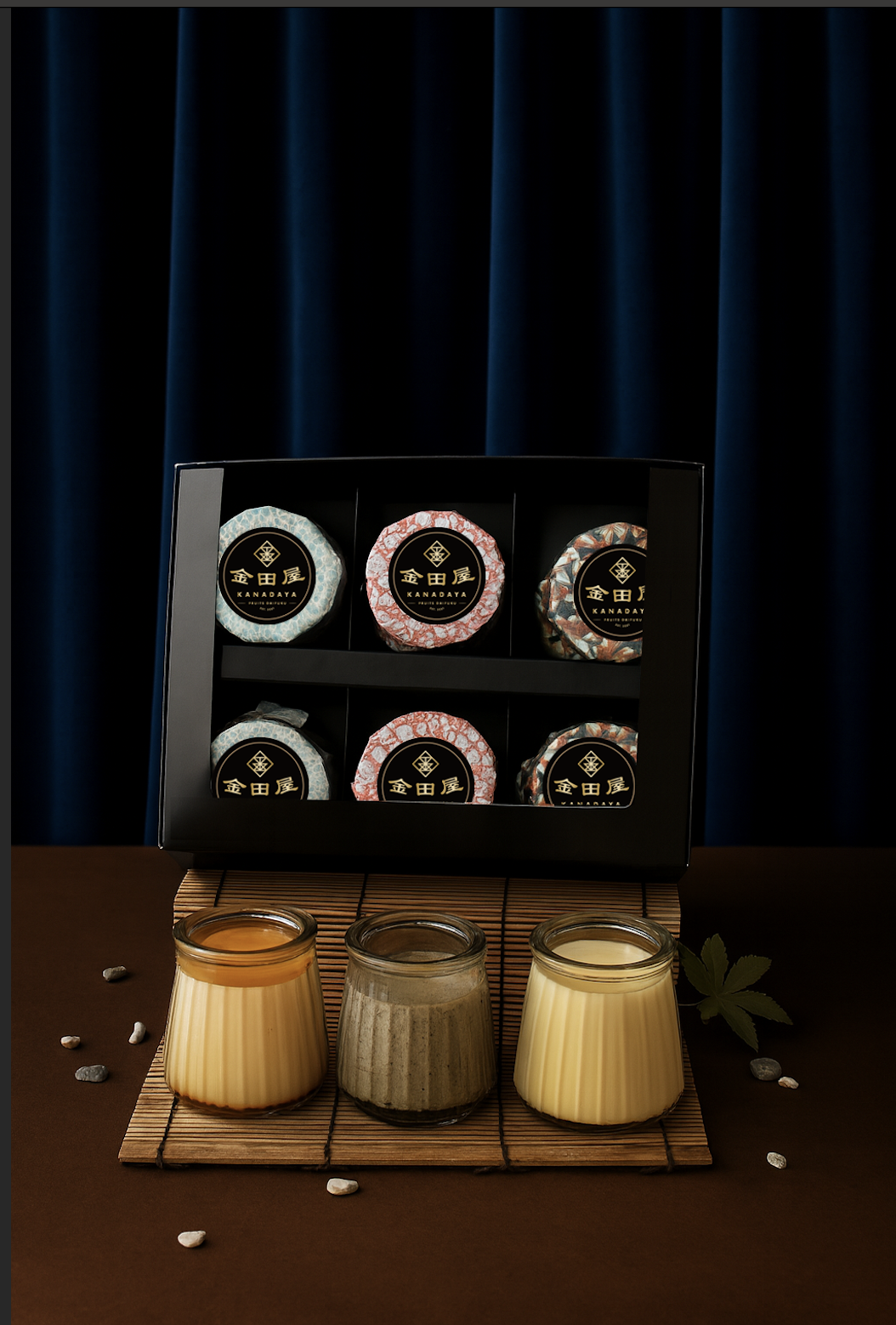 (圖說) 「昭和三韻」布丁禮盒能嚐到日式昭和、昭和芒果、濃醇芝麻布丁3種風味。圖/金田屋提供