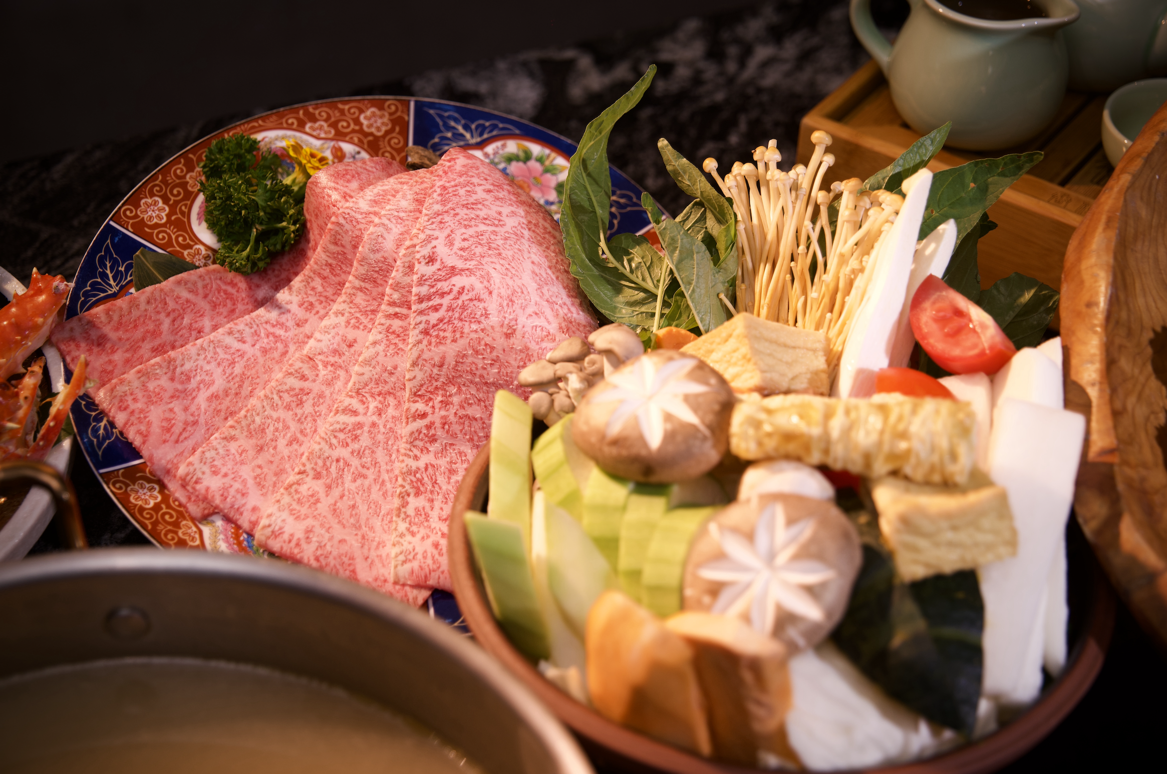 情侶約會最愛雙人套餐,除了大啖美味帝王蟹外,還能品嚐招牌「日本A5和牛翼板」,大理石油花分布均勻,玫瑰色肉質鮮嫩欲滴,放入高湯輕涮幾下,滑嫩多汁的和牛瞬間釋放香氣,令人回味無窮。為無飯不歡的人設計的「北海道海膽明太子茶泡飯」,加入昆布高湯沖泡,融合明太子鹹香與海膽鮮味,美味層次加倍。餐期收尾怎能少了甜點,明星商品「萬丹紅豆鍋餅」外酥內甜,焦香中帶有鑊氣,屏東萬丹紅豆入口綿密、香甜不膩。創意甜點「菊花豆腐」手工切製十分考驗技術,淡雅桂花冬瓜香縈繞舌尖久久不散。飲品可任選「熱鐵觀音」或「熱抹茶」,醇厚茶香降低肉類油膩,回甘茶香令人難忘。