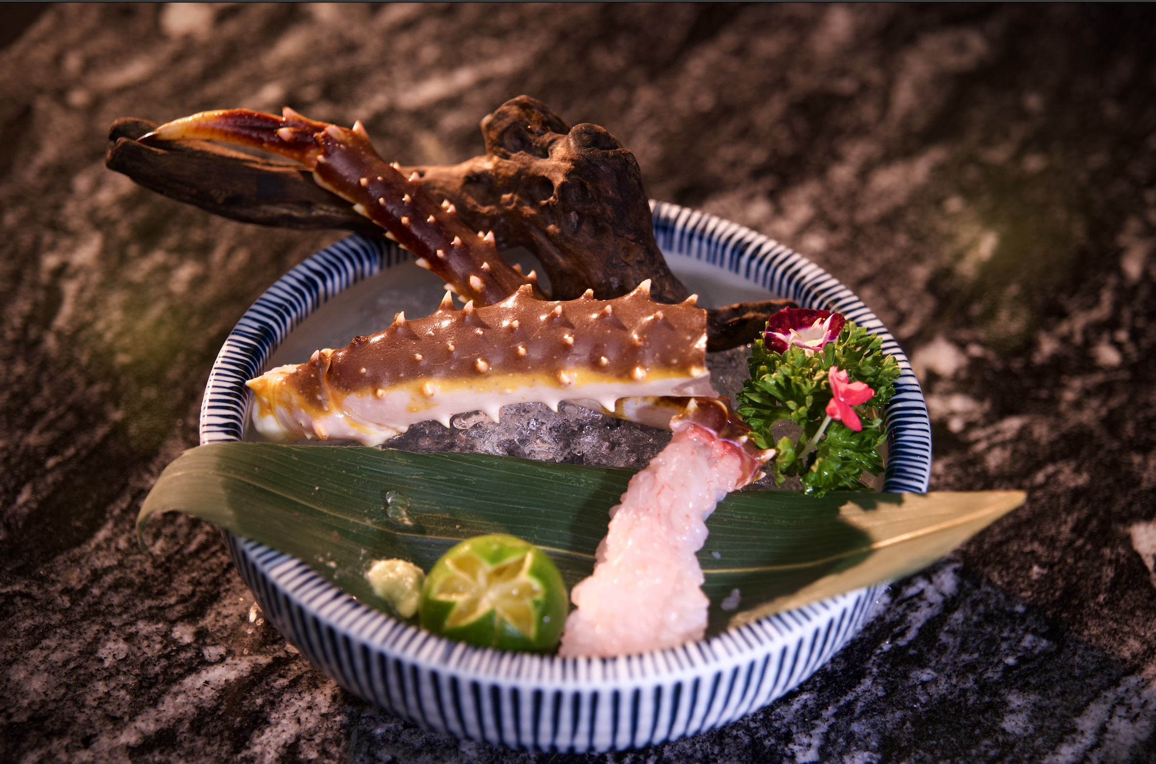 重頭戲帝王蟹五吃,整隻帝王蟹豪邁上桌,在專業服務人員巧手烹調下,演繹出五段層次鮮明的味覺饗宴,每一口都是與大海的親密對話。首先登場是「帝王蟹腿生食」,鮮嫩蟹腿刺身與現磨山葵相伴,微辣山葵在舌尖綻放,襯托出蟹肉自然甜美與彈牙。第二吃「奶油大蔥烤帝王蟹腳」小火慢炙,蟹肉保留原始鮮味,奶油與大蔥香氣迸出新層次,讓人一口接一口停不下來。第三吃「涮煮帝王蟹身」講究食材新鮮度,厚實蟹肉在柴魚昆布湯中輕輕滑入,濃郁海味與甘甜蟹肉相融,日常的忙碌在這一刻慢慢沉澱。第四吃「帝王蟹肉蒸蛋」蟹高湯與滑順蛋液完美融合,每一匙都是溫潤細膩的感動。第五吃「帝王蟹膏粥」取蟹殼與蟹膏小火熬煮,米香與蟹香交織,為饗宴畫上溫柔句點。