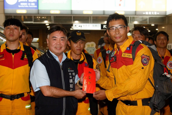 【記者林獻元台中報導】台中市政府消防局27日於台中火車站舉行迎接儀式,熱烈歡迎台中市特種搜救隊第一梯次英雄平安返鄉。消防局長孫福佑代表市長盧秀燕,率市府團隊與同仁一同鼓掌致敬。