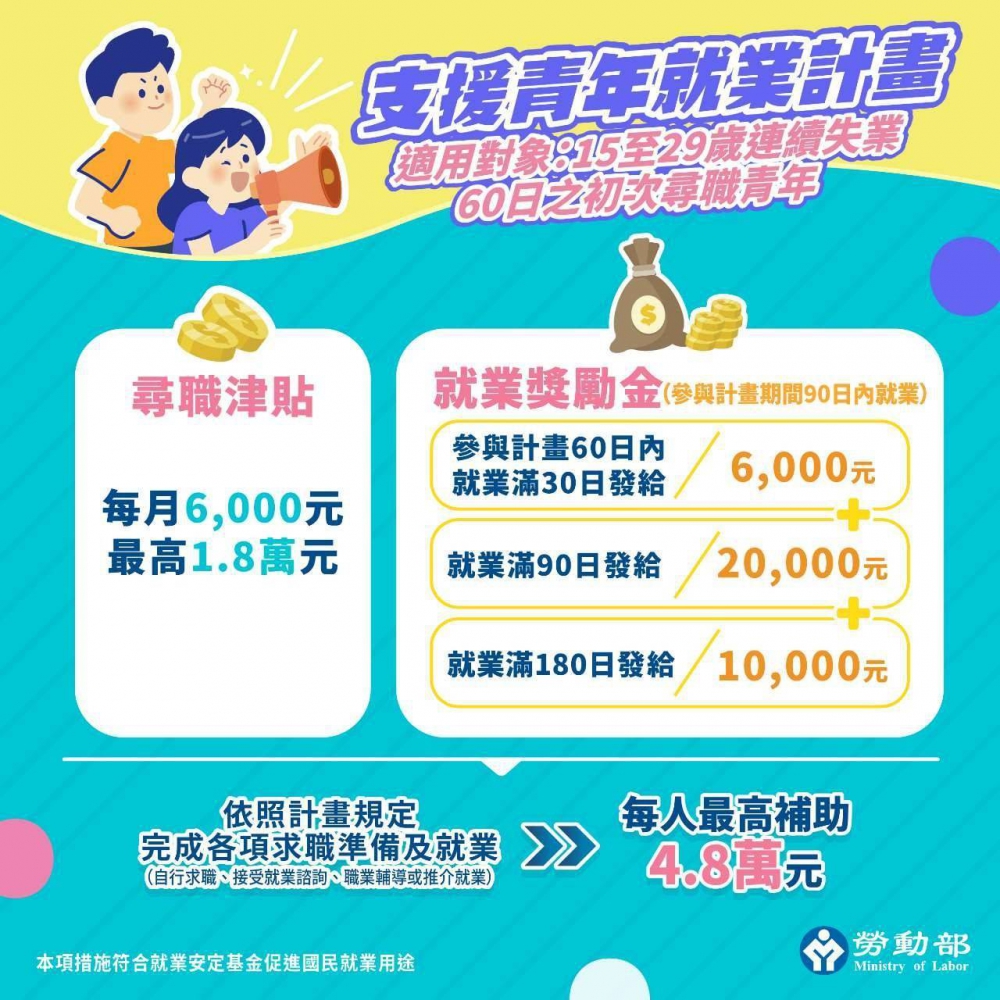 中彰投分署表示,這次勞動部加碼推出的「支援青年就業計畫」,不僅將青年的申請資格由原失業90日放寬為失業60日即可參加;更提高尋職津貼與就業獎勵金額,尋職津貼由每月5,000元提高至6,000元,最高可領18,000元;另若在參加計畫期間內找到全時工作,穩定就業滿90日或180日者,可分別申領就業獎勵金2萬元及1萬元,尋職津貼與就業獎勵金合計最高可領48,000元。想了解更多「支援青年就業計畫」內容,可至「台灣就業通」專區網站查詢(https://special.taiwanjobs.gov.tw/internet/2025/YNGSRH/page-01.html),或洽臺中就業中心(04-23592181分機3723、3728~3729、3731~3734、3738~3740),將由專人提供服務。
