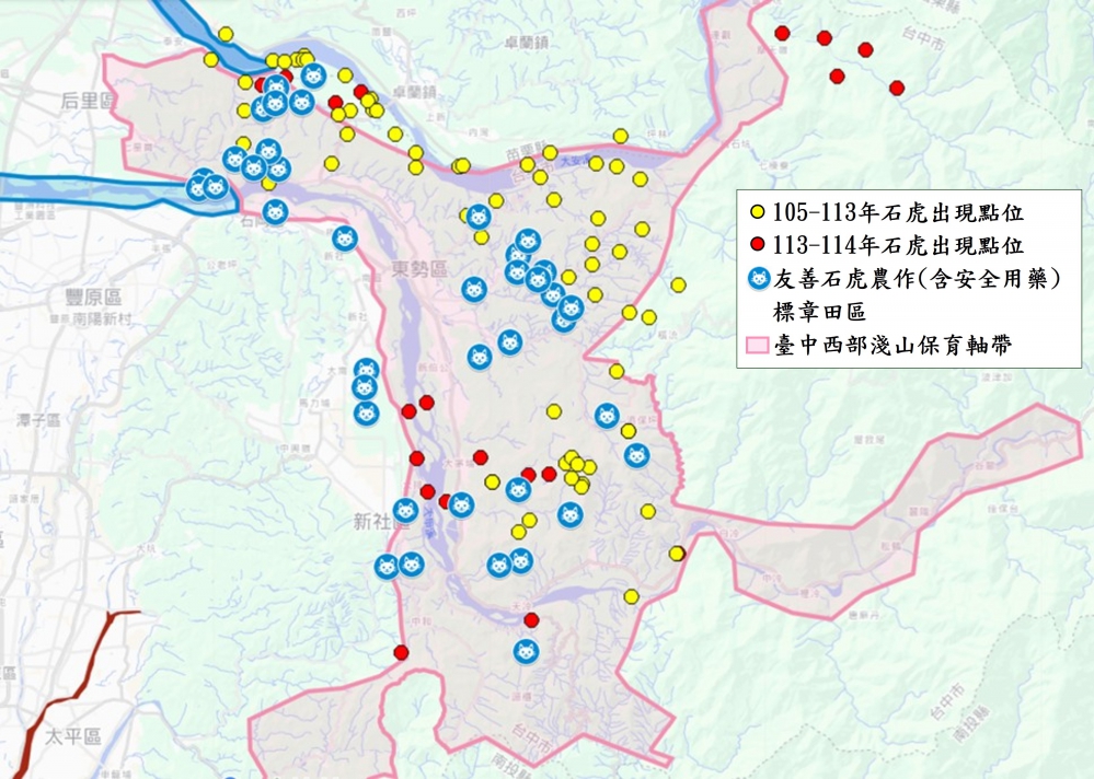 林業保育署臺中分署表示,根據近10年監測數據顯示,105年間僅能在大安溪流域及東勢與和平交界山區零星發現石虎,107年至109年間點位略增,但仍集中於山區地帶。近兩年情況明顯改變,石虎在東勢淺山與大甲溪沿岸的活動紀錄增加,且與該分署推動「友善石虎農作標章」田區範圍高度重疊,顯示友善農業與社區行動正在發揮效益,石虎的生活空間逐步擴張,這項發現也讓長期努力的農友與社區相當振奮!