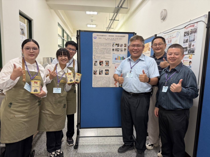 延續去年的「桃醉啡趣」咖啡果肉桃酥,本屆作品「防災米能量Max+」將視角拉回南投縣國姓鄉在地文化。團隊以客家傳統鹹擂茶為靈感,融合糙米、堅果與鹹香元素,研發成兼具營養與保存力的防災食品。不僅能在緊急時刻提供能量補給,更蘊含「在困境中也要成功」的品牌寓意。品牌名稱「成功」不僅連結國姓鄉與鄭成功的歷史意涵,也象徵文化承繼與希望延續。三位學生在研發過程中展現高度默契,從構想、配方調整到成果發表,歷經多次嘗試與修正,最終獲得評審一致肯定。楊豐銓同學表示:「我們不只是想做新口味,而是希望它能在最需要的時刻守護大家。」這份溫度與寓意,使作品超越單純食品研發,更成為文化與韌性的展現。