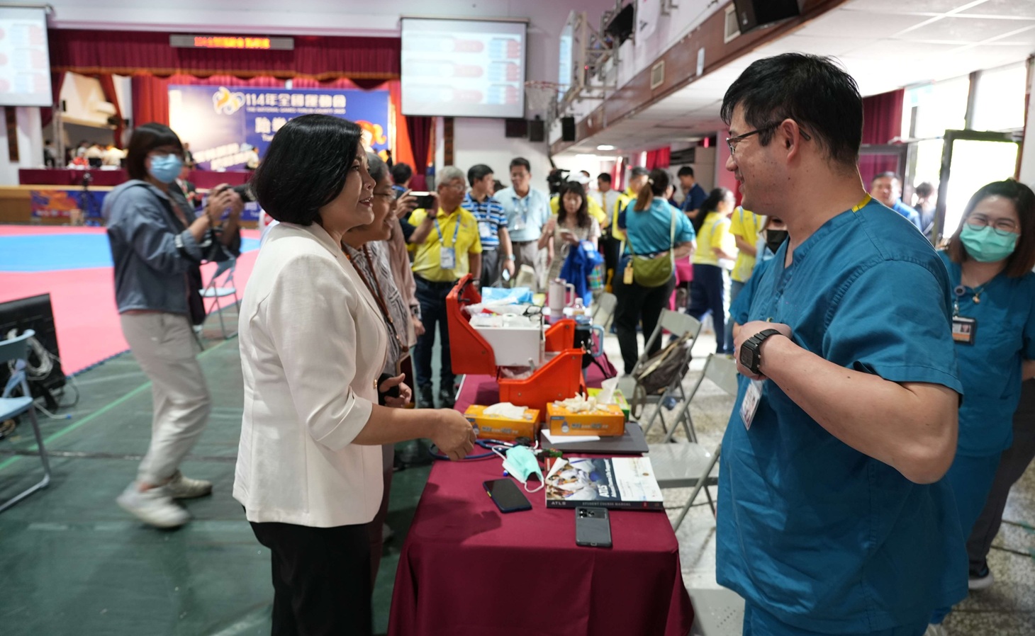 【記者蘇峯毅/雲林報導】114年全國運動會已有多個競賽項目登場,縣長張麗善16日前往跆拳道比賽會場西螺農工,關心會場運動防護與醫療照護配置。縣長張麗善表示,全運會各場館均設置運動防護站、醫療站,規劃綠色通道,讓每位選手在安全無後顧之憂下全力拚戰,拿到最佳成績。