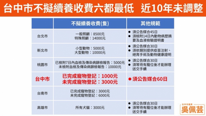 吳佩芸進一步指出,更令人擔心的是,臺中市雖然不擬續養數量最多,但收費卻是六都最低。目前臺中市針對不擬續養收費部分,已完成寵物登記的飼主,只收取1000元;未登記的,也僅收3000元。