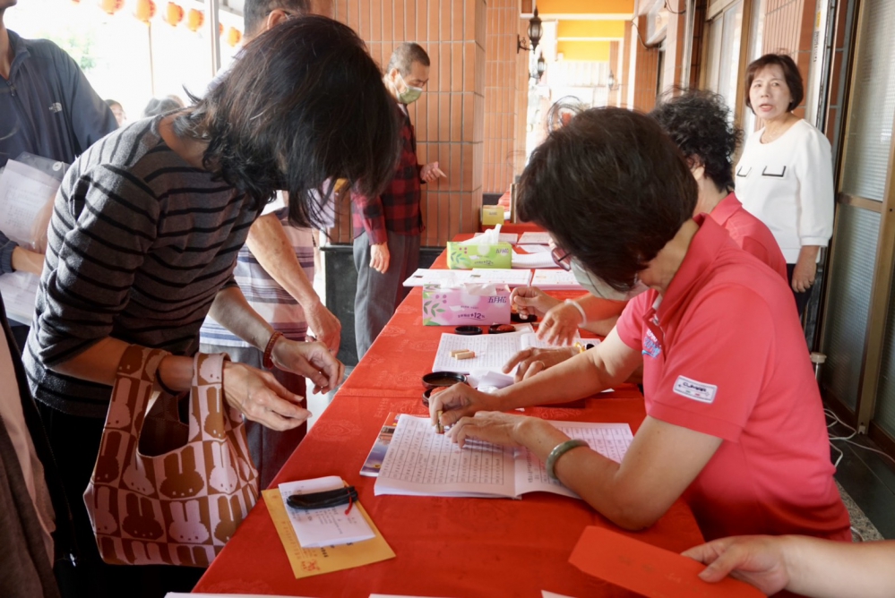 萬和宮在萬和文化大樓一樓騎樓發放,誦經團志工熱心服務,她們很快核對資料無誤,發給獎學金時,都不忘說聲:「恭喜!」