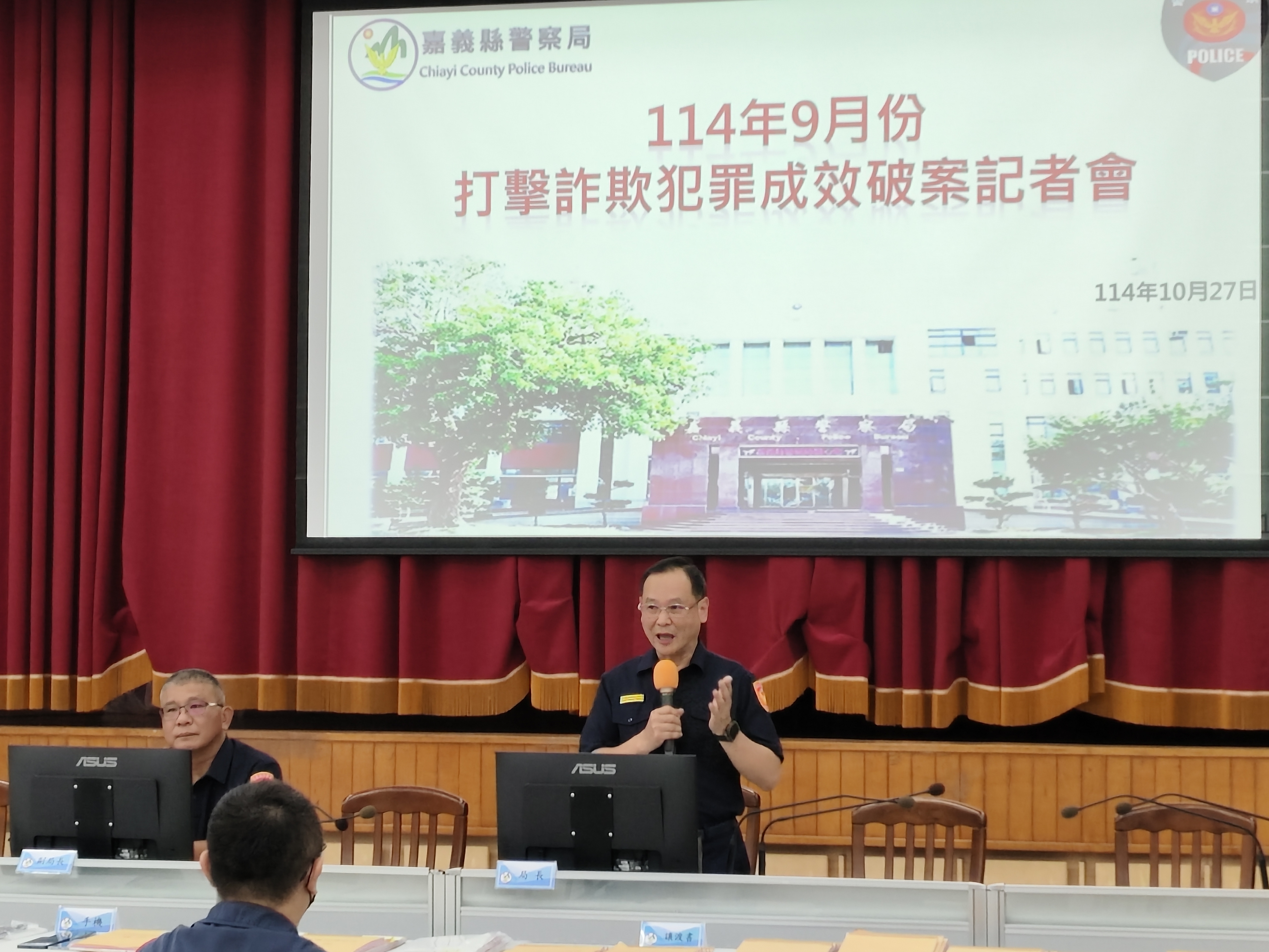 嘉義縣警察局長李權哲主持「打擊詐欺犯罪成效破案」說明會。(圖/記者任芳葵攝)