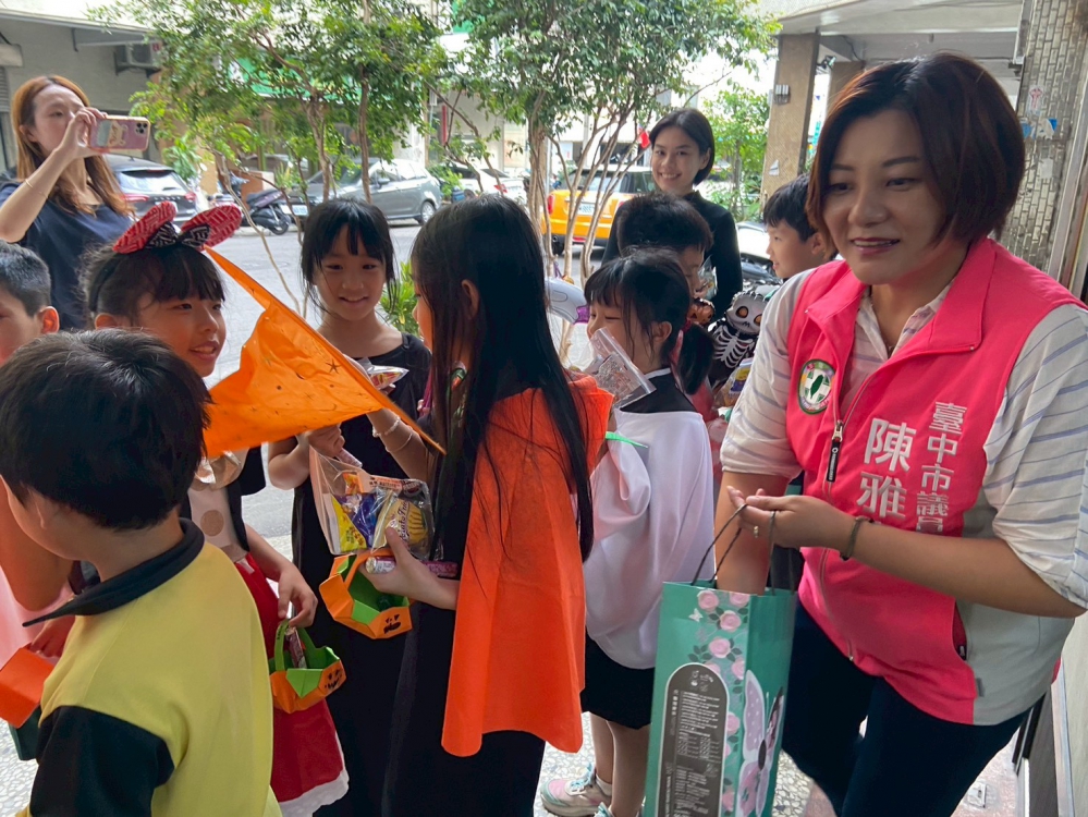 小朋友們化身南瓜、女巫、蜘蛛人、鬼滅之刃角色等,提著南瓜桶、手拿萬聖節小禮袋,一一向議員喊出「Trick or Treat!」。陳雅惠議員親自迎接,準備了滿滿的糖果和小餅乾,分送給每位小朋友,並稱讚大家的裝扮既可愛又有創意。