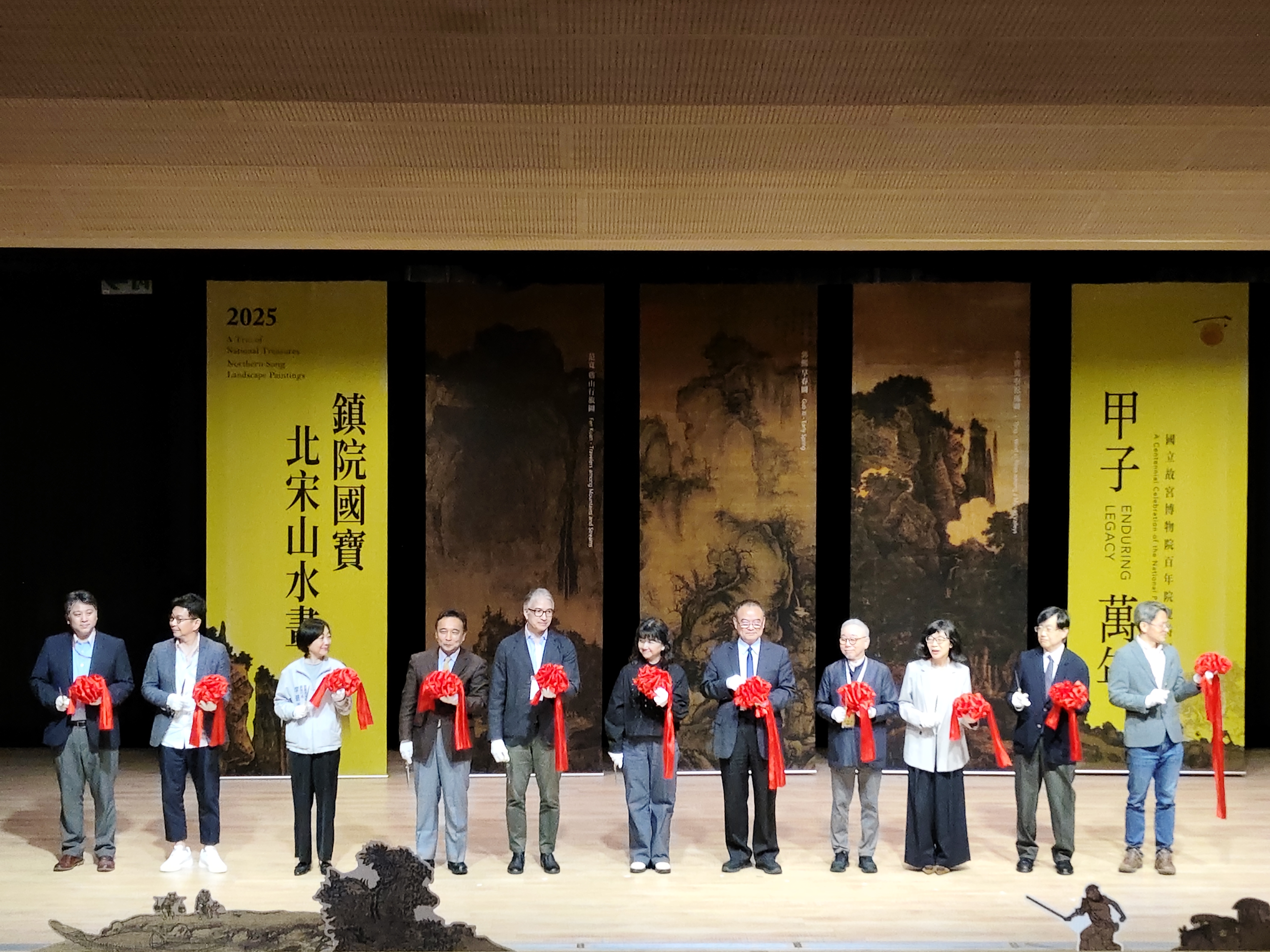 故宮南院11日舉行「甲子萬年:國立故宮博物院百年院慶特展-北宋山水畫」開展典禮,學術界、文化藝術代表及眾多媒體齊聚一堂,由國立故宮博物院院長蕭宗煌、副院長余佩瑾、中央研究院院士石守謙、文化部政務次長李靜慧、英國牛津大學教授 J. P. Park、美國哈佛大學教授Yukio Lippit、日本東京大學教授板倉聖哲及九州大學教授井手誠之輔、行政院雲嘉南區聯合服務中心副執行長李碧菁…等貴賓共同揭開序幕,凝聚各界對故宮百年的祝福。