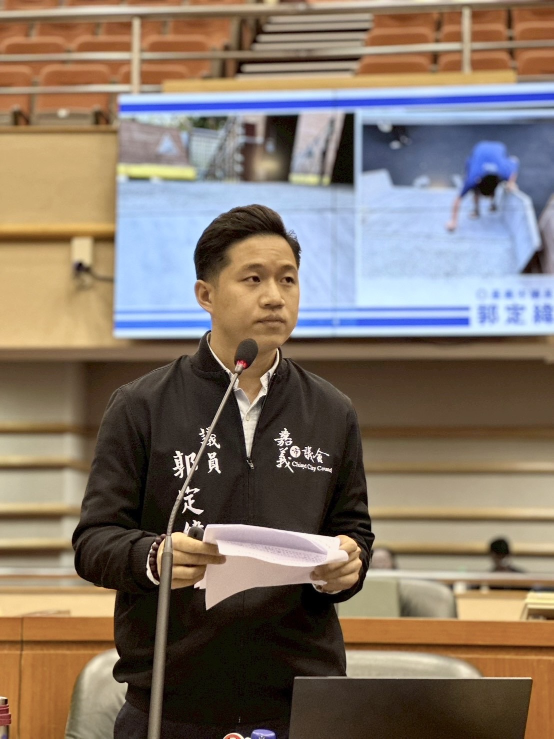 郭定緯指出,嘉義市目前共有38座公園,密度雖然高,但孩子放電,家長卻差點漏電。他提到,去年曾帶孩子至嘉義公園遊戲區遊玩,發現溜滑梯攀爬區繩索卡榫斷裂、繩子散落在地,小孩仍照常攀爬,現場極為危險。當下他立即聯繫建設處協助圍起與修復,事後不禁思考:「要是一般家長遇到這種狀況,該怎麼報修?」