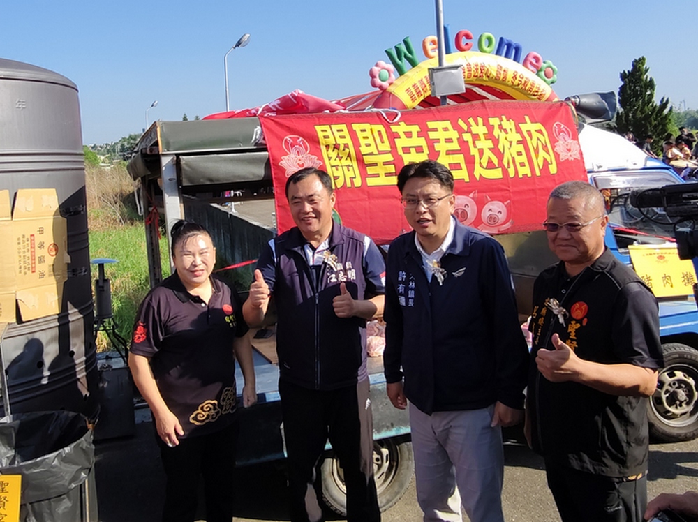 國人中斷多日沒吃到溫體豬肉,大林鎮聖賢宮依關聖帝君指示苦民所苦發放新鮮豬肉給中低收入戶。(圖/記者任芳葵攝) 寒冬送暖活動首先由關帝雷舞團、聖賢宮關刀團精彩演出,雷舞團小妹妹使出渾身解數,帶動現場熱鬧氣氛;關刀團舞起沈重關公刀虎虎生威,令現場觀眾鼓掌稱讚。還有林姵縈創作舞團、楊美玲舞蹈班、大林鎮農會舞蹈班、社團國小鼓隊等先後上台表演,贏得熱烈掌聲不斷。