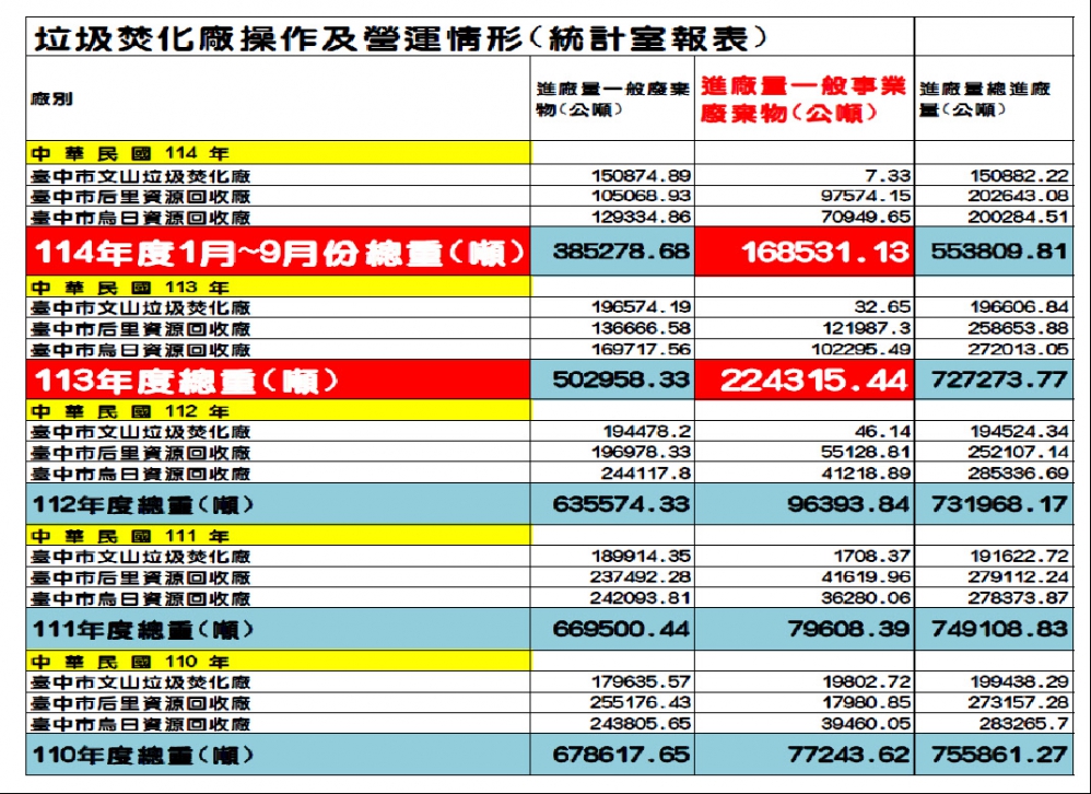蕭隆澤依環保署與環保局公開資料指出,110至112年間,台中一般垃圾每年平均約66萬噸,113年卻只剩50萬噸,整整少了16萬噸;但同期間事業廢棄物量卻從每年6至7萬噸暴增至22萬噸,今年至9月更突破16萬噸。他質疑,「人口增加十幾萬,垃圾卻少二十幾萬噸?難道台中人都變無敵鐵金鋼、不會丟垃圾了?沒有鬼才怪!」