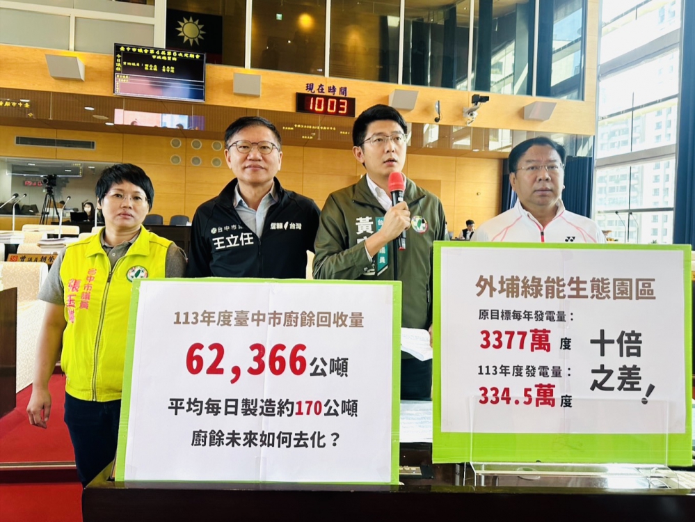 黃守達進一步指出,就算外埔綠能生態園區二期最終能夠順利推動,依照市府原本規畫,二期設備每年約可處理2.4萬公噸左右的熟廚餘,等於一天可處理約65公噸熟廚餘,若一日產生170公噸的廚餘量,生廚餘每天可以處理約75公噸,過往堆肥平均下來一天頂多處理1公噸,那也還有29公噸的缺口,市府到底要怎麼解決?