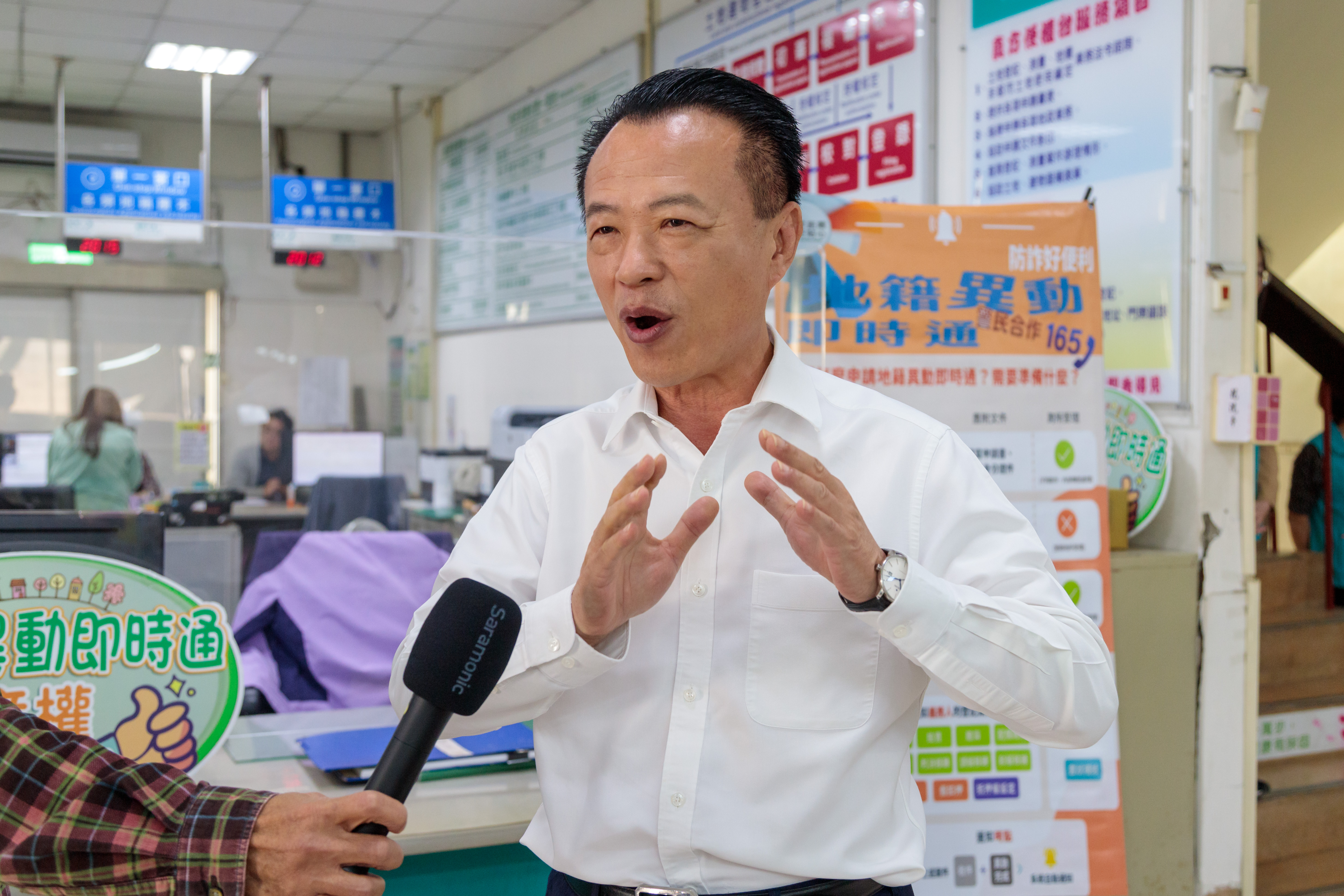 嘉義縣府與警察局在朴子地政事務所取景拍攝防詐短片,強力呼籲民眾防詐別輕易上當受騙。(圖/嘉義縣政府提供)