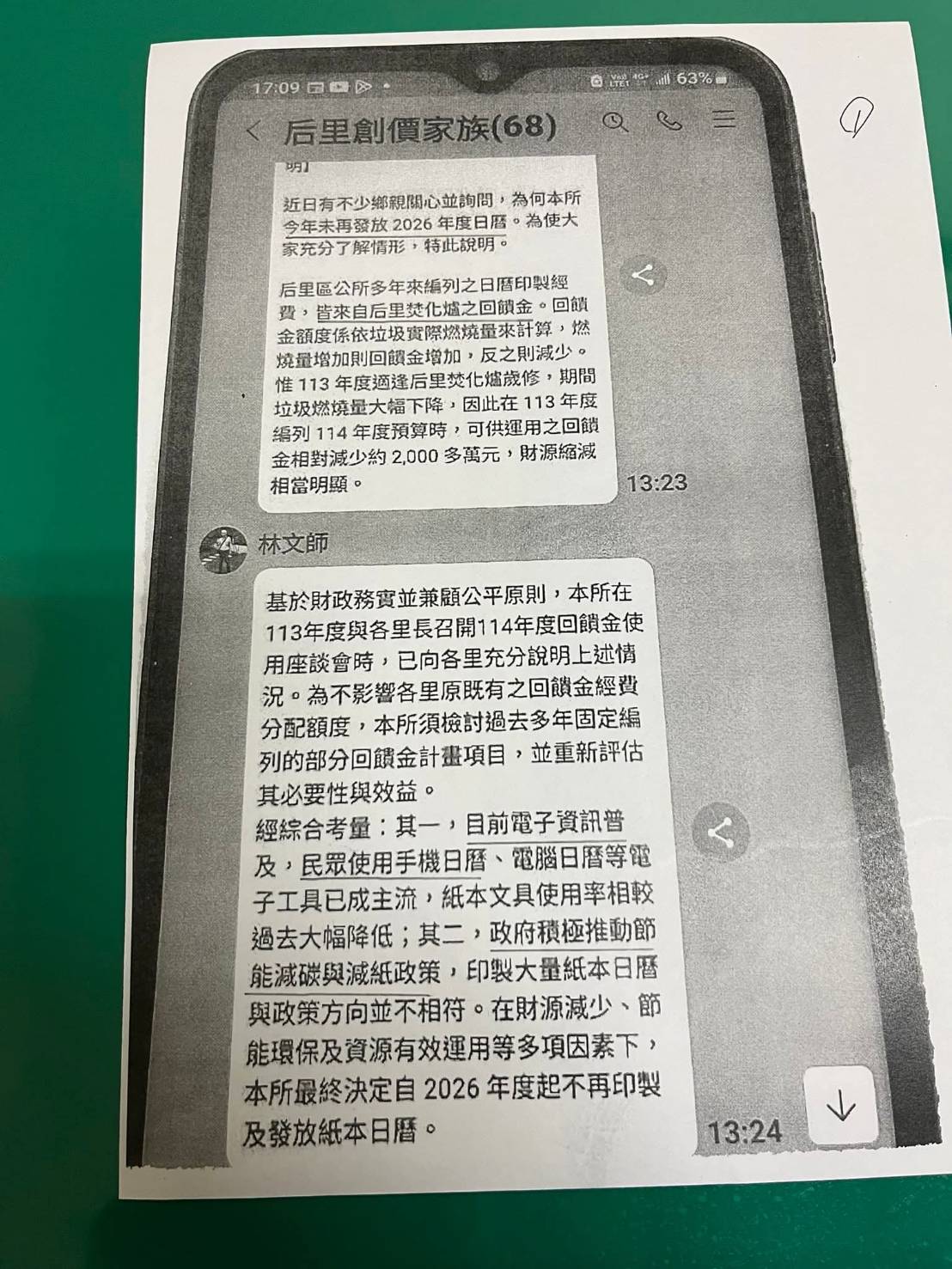 后里區公所今年未印製紙本日曆、引發廣大民眾討論、公所表示:因應電子資訊普及、多數民眾可以使用手機或平板查看日曆、為節省資源與推動環保、決定暫停印製2026年日曆發放民眾、然而許多年長者居民反映、雖手機普及、但操作智慧裝置仍有困難、紙本日曆仍具實用性、尤其在記事、節氣提醒與農曆查詢上更為便利。