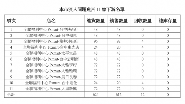 【記者林獻元台中報導】全聯高雄路竹中正店販售的「台灣鯛魚排」,日前被高雄市政府檢驗出含動物用藥「恩氟喹林羧酸(enrofloxacin)」,台中市政府食安處表示,經查台中市有11家全聯門市進貨同一批次產品,市府1日獲報後立即派員稽查,該11家門市共進貨624包,其中612包已售出,12包已下架回收,食安處後續將針對水產品全面擴大稽查抽驗,維護民眾食品安全。