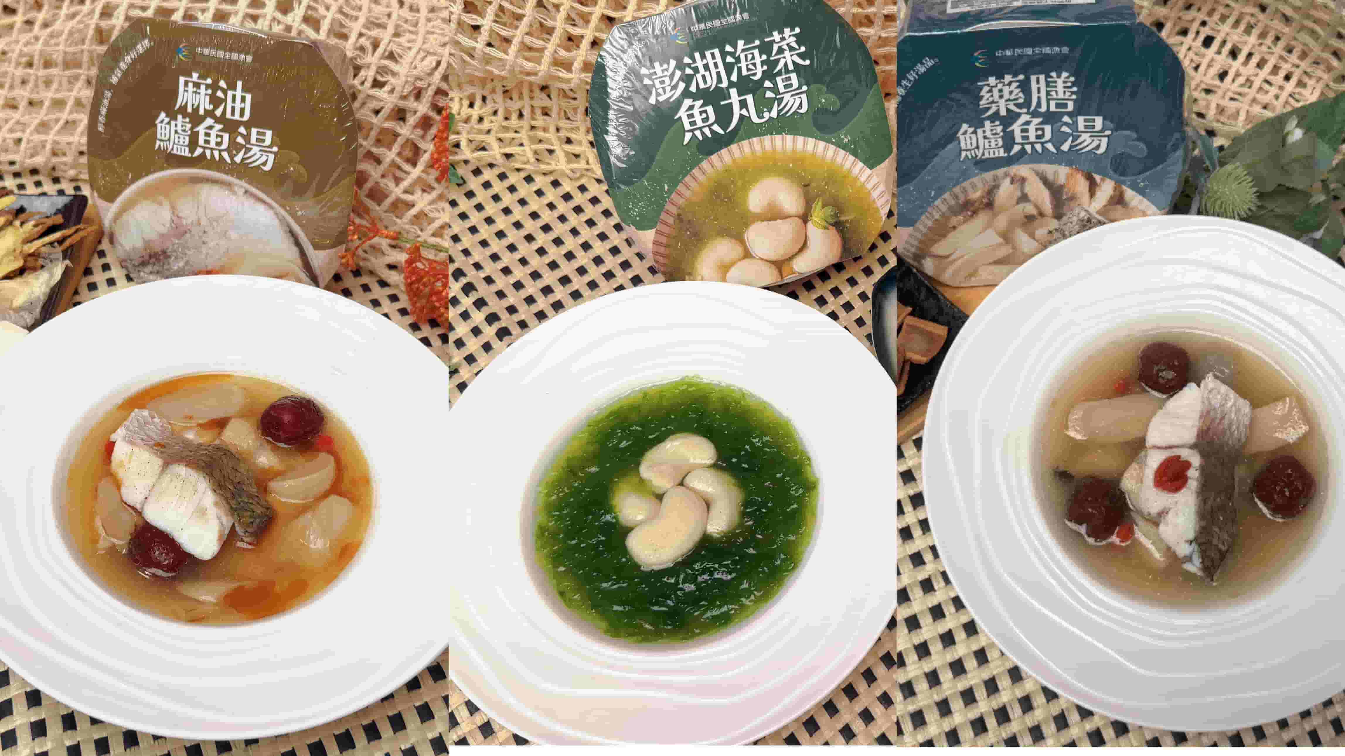 漁業署與全國漁會指出,此次為兼具便利與養生特色,只需結帳、加熱即可食用,滿足忙碌上班族及小家庭的需求,強強聯手推出三款加熱即食湯品皆嚴選優質國產水產品,兩款鱸魚湯品各展不同風味,『藥膳鱸魚湯』入口溫潤不燥、『麻油鱸魚湯』薑韻交疊麻油香,暖而不膩;還有來自澎湖在地『澎湖海菜魚丸湯』,湯頭清甜、魚丸Q彈,老少皆宜。