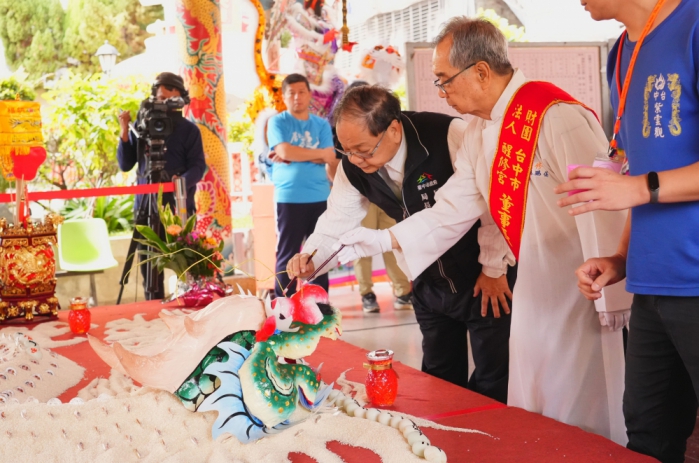 民政局補充,米龍開光大典為台灣傳統廟會與醮典中的重要儀式,此次醒修宮特別打造長達32尺的米龍,並由吳局長與林董事長共同為米龍「開光點睛」,象徵喚醒龍神降臨、鎮守地方,祈求風調雨順、國泰民安及五穀豐收,並寓意趨吉避凶、招財納福。