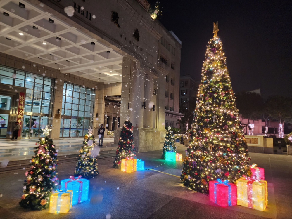 接續於17日,豐原陽明市政大樓(豐原區陽明街)正式點亮聖誕樹、光瀑布及周邊燈飾,整點搭配飄雪效果,營造浪漫的「雪國聖誕」氛圍。