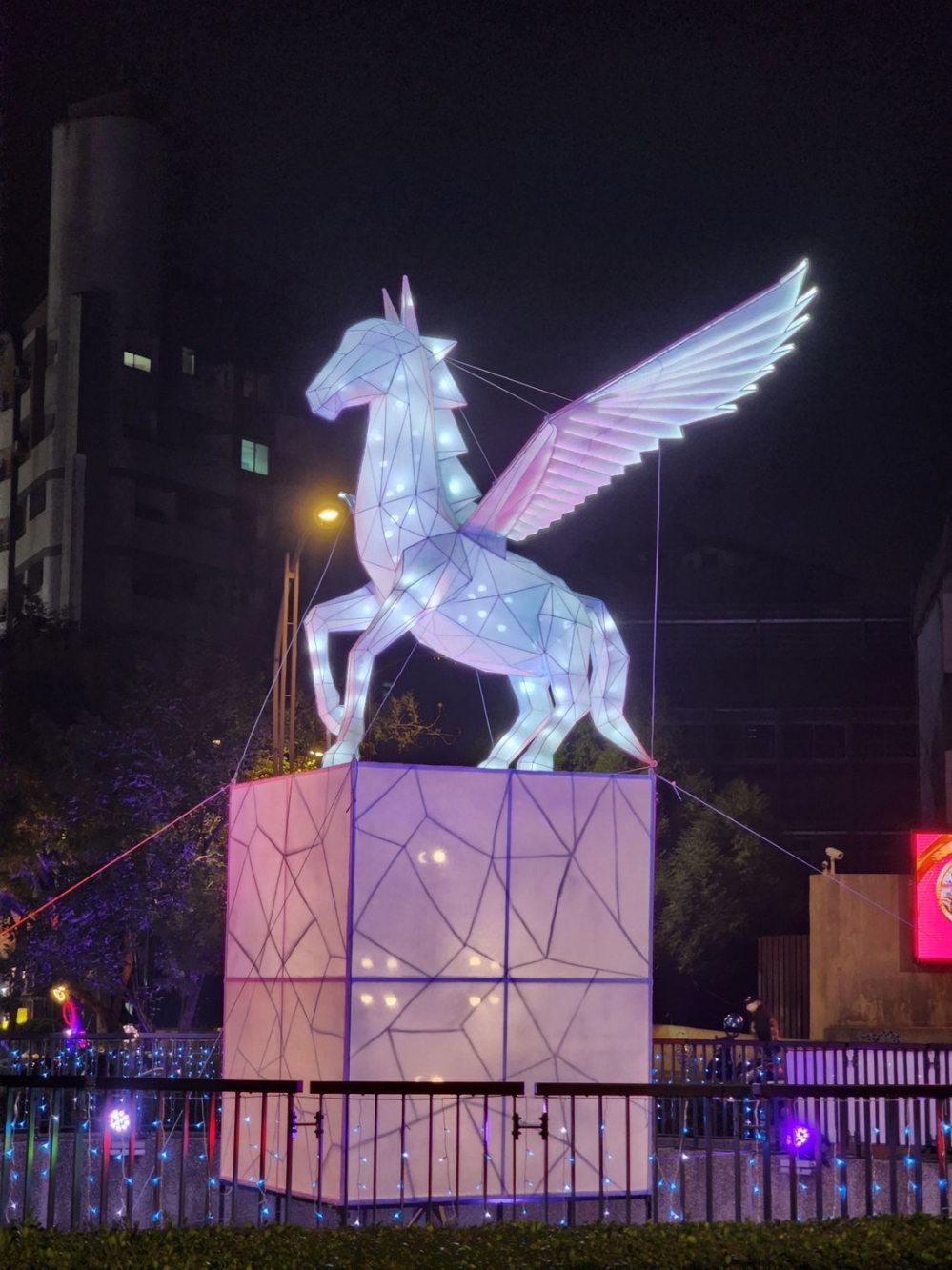運用飛馬、金色瀑布、願望光束、水岸花都等燈飾元素,透過光影律動展現多層次視覺效果,象徵「願望在豐原升空、幸福在水岸落地」,打造具節慶氛圍的特色水岸燈帶。