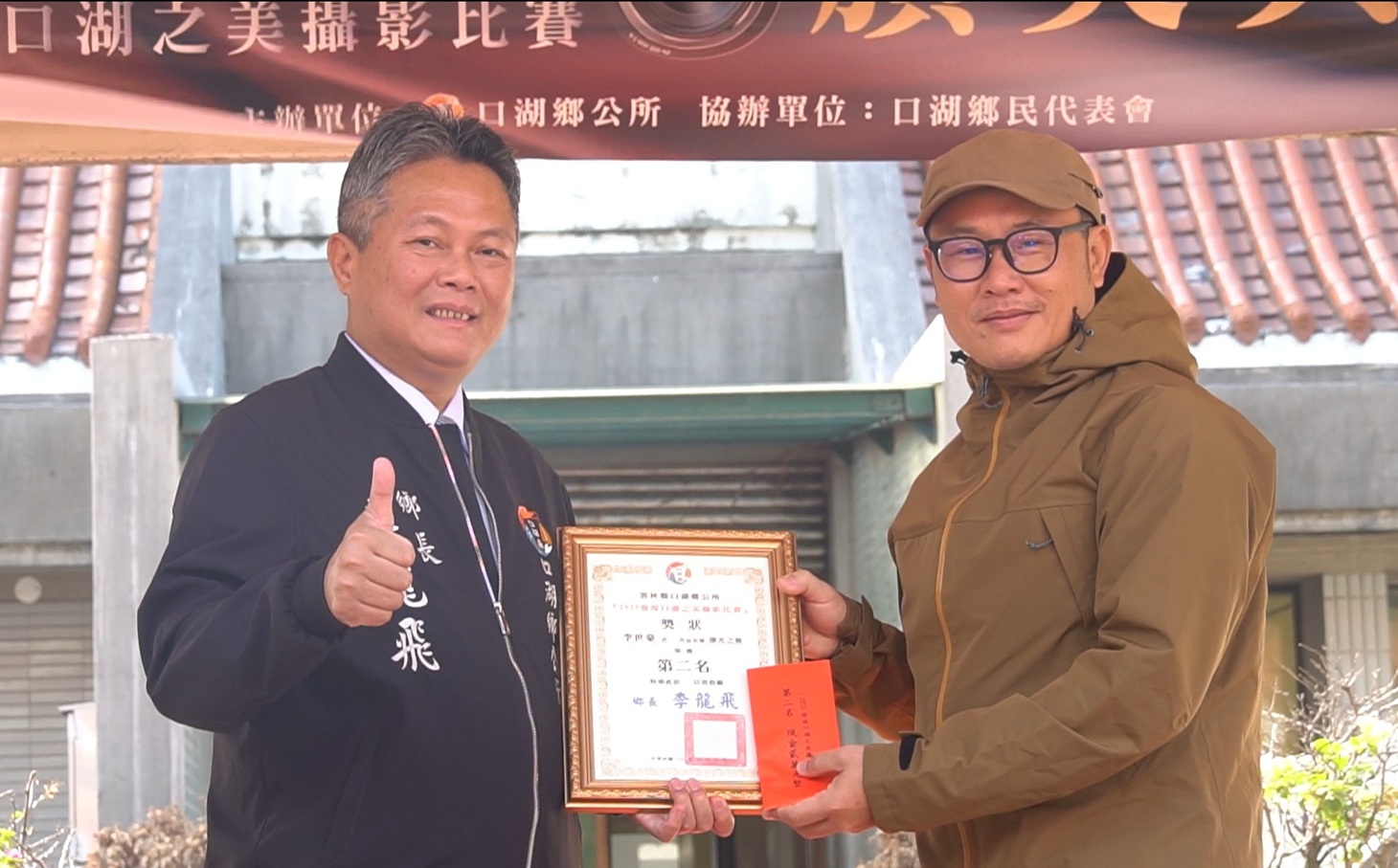 鄉長李龍飛親自頒發攝影比賽第2名得獎者李世豪,獲得獎狀及2萬元獎金。