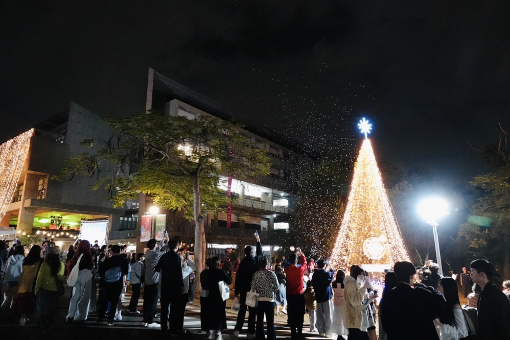 入夜後,路思義教堂外牆同步展演大型光影投影,信仰意象在夜空中緩緩展開。校園內亦安排耶誕公車串聯各主要場域,沿途規劃聖誕市集與文創攤位,並由學生會與社團共同策劃DJ派對、生存遊戲等聖誕快閃表演,為節慶夜晚注入青春活力。今年因攤商數量增加,校園整體氛圍更顯熱絡,吸引不少民眾駐足停留,宛如一場溫馨而流動的節慶嘉年華。