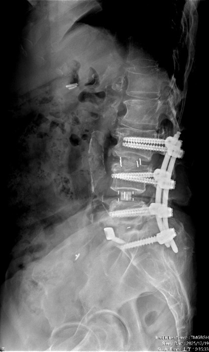 【記者張原銘、張皓傑台中報導】65歲婦人,長期飽受腰痛、下肢痠麻及坐骨神經痛所苦,行走距離逐年縮短,嚴重影響日常生活。過去曾接受膝關節保膝手術及脊椎內視鏡減壓治療,初期恢復良好,惟因仍存在多節段腰椎退化性狹窄與骨刺問題,加上彎腰負重及久坐等生活習慣未能完全改善,症狀逐漸惡化,甚至出現神經性跛行。經臺中市立老人復健綜合醫院骨科部副部長林琮凱醫師詳細檢查後,診斷為第三、四、五腰椎合併第一薦椎之多節段脊椎狹窄與神經壓迫。醫療團隊與病患及家屬充分溝通後,決定採用電腦導航輔助之前位/前側位脊椎融合手術,並合併後方骨釘固定,一次完成多節段重建。術後病患神經症狀明顯改善,行走能力恢復,生活品質大幅提升。