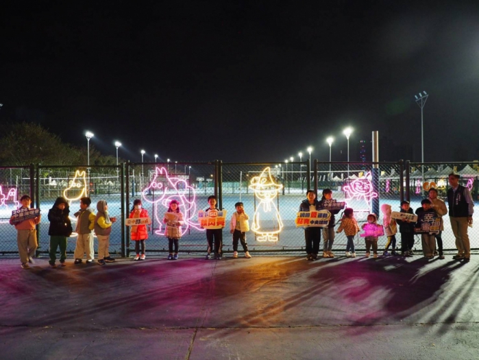 感謝台中藍鯨運動熱區足球班的小球員,從2歲到10歲踴躍參加,也感謝家長熱情出動,一起在中央球場點亮運動的「幸福蜜馬」。另外,游局長也提醒,燈會期間(2月15日至3月3日),民眾於中央公園賞燈之餘,也可前往中央球場與姆明合影,按下「GO」鍵啟動互動燈光。