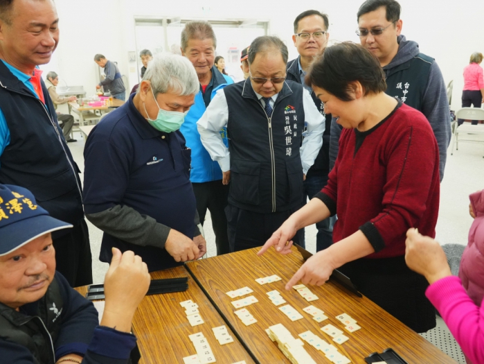 吳世瑋並實地關心長者參與活動情形,現場可見長者們分組圍坐,在輕鬆愉快的氛圍中專注投入以色列拉密桌遊。透過桌遊活動,長者不僅能訓練腦力、提升專注力與手眼協調能力,也能促進人際互動與情感交流,增進彼此情誼。