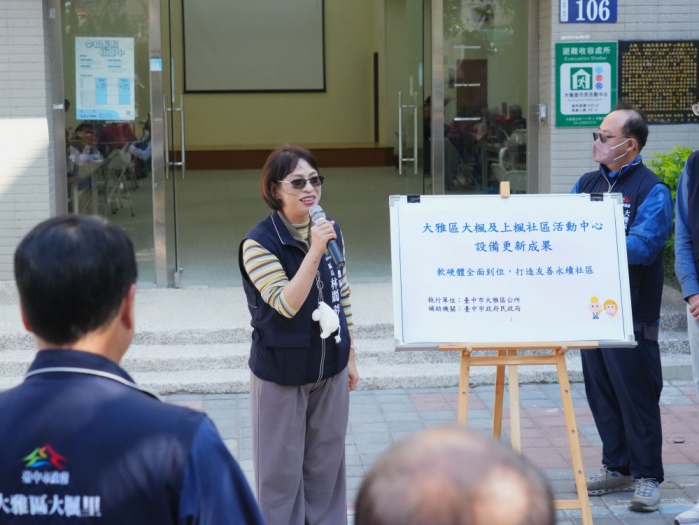 大雅區長林麗蓉表示,感謝市府支持地方建設,讓大楓、上楓里市民活動中心在完成空間擴充的同時,也能同步更新既有設備,讓地方基礎建設服務品質大幅提升,預估設備更新後每年可服務超過1.2萬人次,為社區帶來更多活力。未來公所也將持續爭取資源,依照里民需求改善設施,打造更友善、宜居、永續的大雅生活環境。