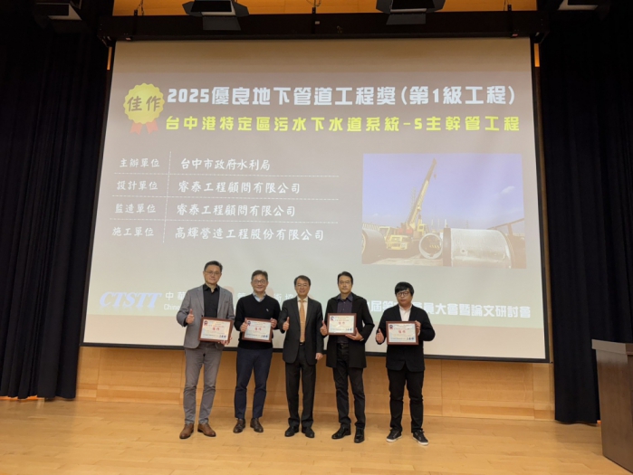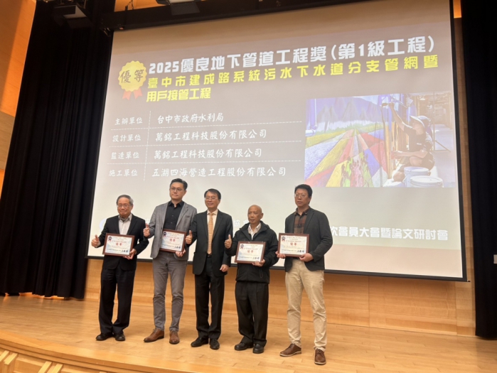 【記者林獻元台中報導】中華民國地下管道技術協會主辦「114年度優良地下管道工程頒獎典禮」於16日在國立台北科技大學集思會議中心盛大舉行,台中市政府水利局以「台中市建成路系統污水下水道分支管網暨用戶接管工程」及「台中港特定區污水下水道系統-S主幹管工程(一)」兩案,分別榮獲工程獎(第一級)優等及佳作殊榮,展現市府在污水下水道工程建設及推動用戶接管上的卓越成果,深獲業界肯定。