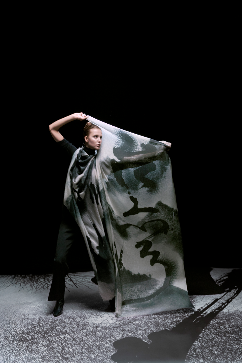 (圖說)圍巾作品〈島語〉為聯手書法家 董陽孜共創結晶。YEN TING CHO Studio提供