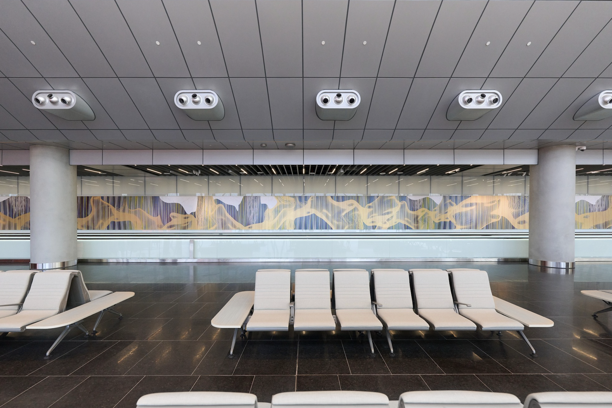 機場作為高度流動的空間,《國境之門.島嶼寓言》特別思量旅客於舒適行進與定點停駐之間的多變觀看視角。作品以全幅尺度回應建築與動線,透過細節密度與層次變化,使旅客在不同距離與角度中反覆閱讀,產生多層次的觀看經驗,促成與各國旅客之間的跨文化對話。