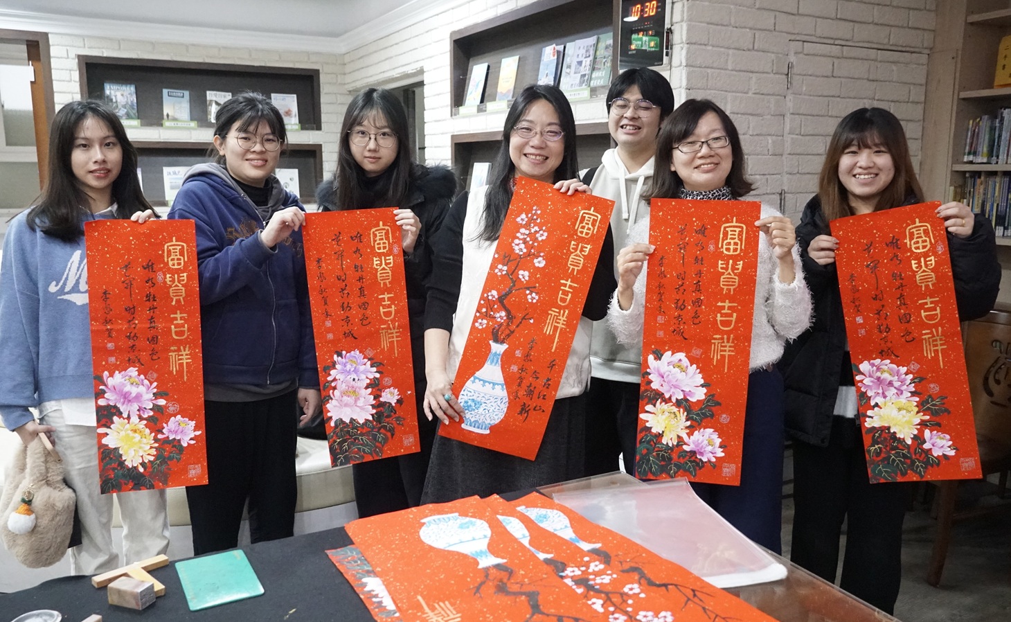北港高中邀請6位地方知名書法家齊聚校內圖書館,現場揮毫寫春聯、繪製年畫,贈送給校內同仁與來賓,提前向大家送上新春祝福。(圖/記者蘇榮泉攝)