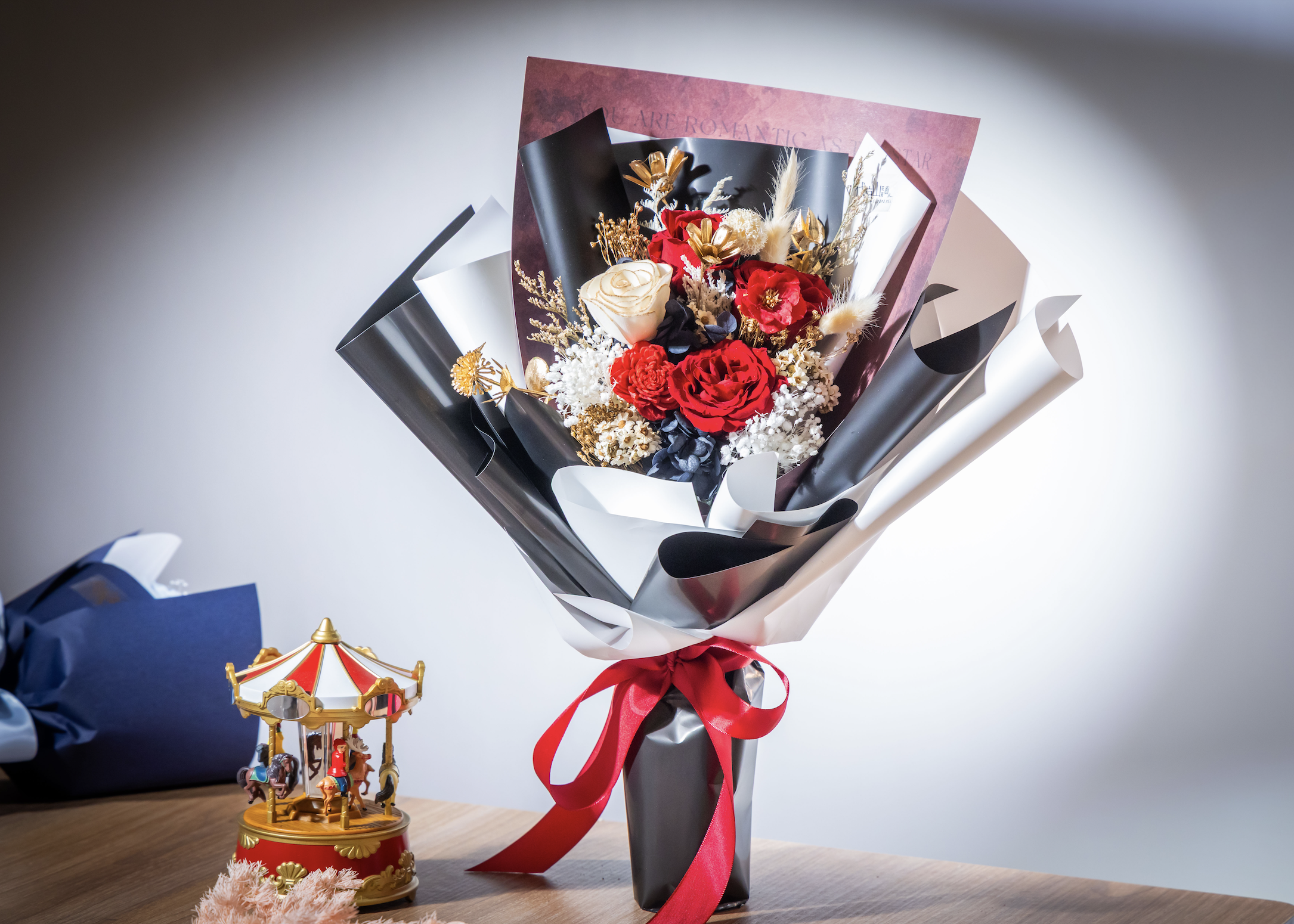 店內提供鮮花、永生花與客製花束等多元服務,永生花禮價格自 1680 元至 9999 元不等。 其中以 2680 元的「嫣然|花霞永生玫瑰花束」最受歡迎,嚴選日本進口永生玫瑰,以粉白 的三朵玫瑰低聲訴說情感寓意「不張揚的愛,卻剛剛好住進心裡」。小巧而內斂的花束輪廓, 搭配簡約而細膩的設計語彙,讓心意在靜靜綻放之間,被完整傳遞。3680 元的「奢綻|夕凪 永生玫瑰花束」充滿浪漫氛圍,三朵紅色永生玫瑰,訴說著「這不是試試看,是正式站出 來」的濃濃情意,紅色永生花將每朵玫瑰最美的姿態定格在那一刻,展現簡單低調的祝福話語。