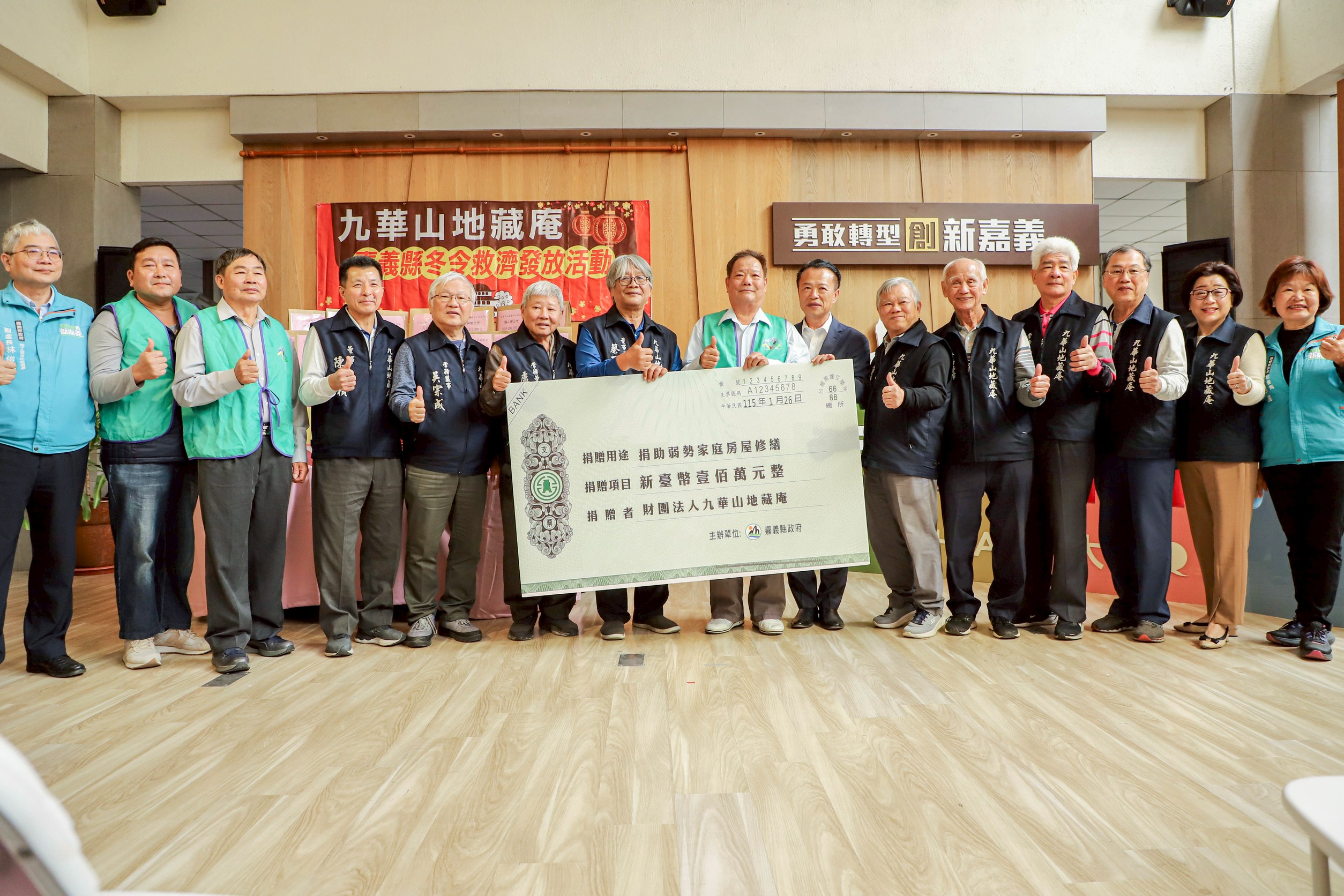 九華山地藏庵持續關懷弱勢家庭,捐助嘉義縣冬令慰問金及修繕協助金。(圖/嘉義縣政府提供)蔡爾健說,今年一共捐贈930多萬,透過嘉義縣政府協助幫助民眾過個好年,只要這個社會有需要,接下來也會持續捐款幫助大家。