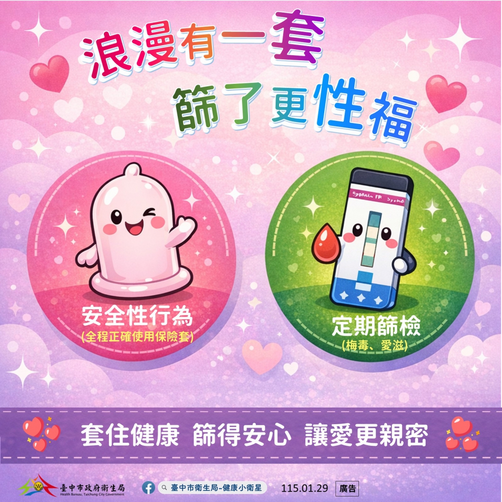 隨著西洋情人節及農曆春節連假將至,假期間社交聚會與親密互動機會增加,市府衛生局長曾梓展特別提醒民眾,應避免與不特定對象發生親密行為;如有發生親密行為,務必做好完整防護,最有效預防性傳染病的方式為「全程正確使用保險套」,才能安心享受「性」福。為提升民眾購買保險套的便利性,衛生局於114年增設9台保險套販賣機,目前全市共設置36台,有需求的民眾可就近購買使用。
