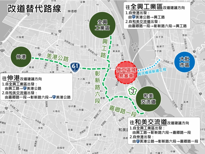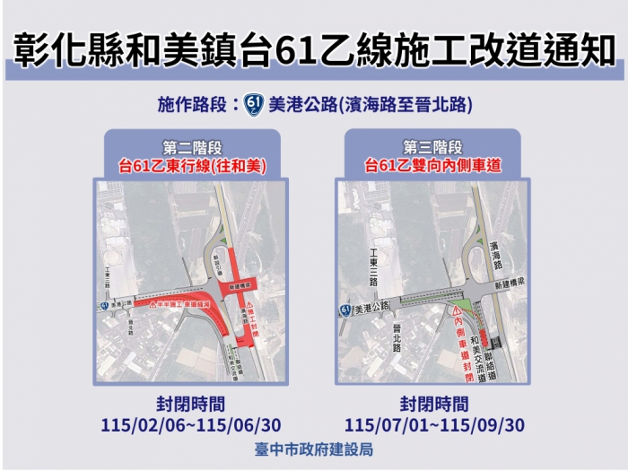 建設局表示,第二階段交通管制將封閉台61乙東行線(往和美方向),並改道至西行線,原雙車道將調整為「雙向各一車道通行」,濱海路(國道三號橋下路段)亦同步封閉。