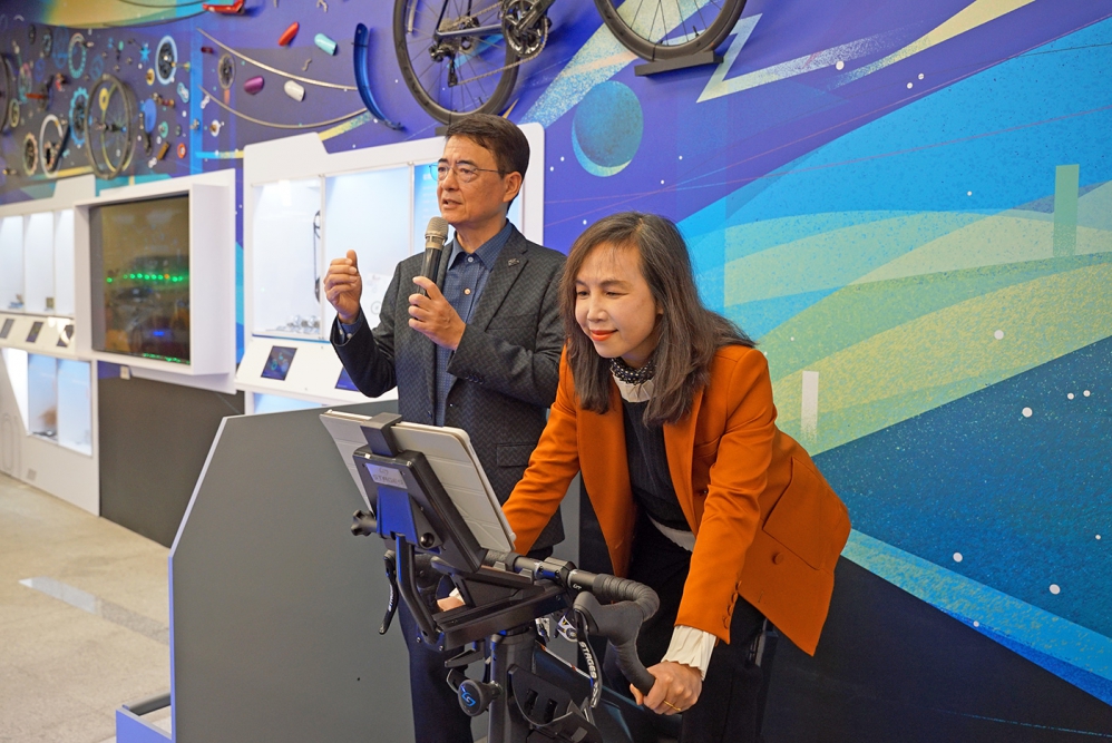 展覽以創新策展手法,將自行車拆解為關鍵零件,結合展示牆、動態螢幕、電子書與互動體驗台,讓觀眾親手轉動、操作,理解速度、力量與結構之間的關係。現場同時展示碳纖車架實體,並設置變速器操作體驗與室內騎行台,讓民眾從認識零件到實際騎乘,一次體驗自行車的科技與樂趣。
