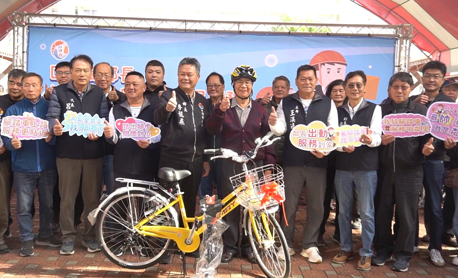 鄉長李龍飛與鄉代會主席王溪邊率同村鄰長踏上腳踏車,正式啟用新購置之服務腳踏車。