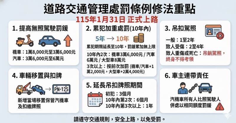 警方說明,新制除提高罰鍰金額,更大幅加重累犯與車主責任。無照駕駛機車最高可罰3萬6000元,小型車6萬元,大型車則高達8萬元;10年內第2次違規即處最高額罰鍰並吊扣牌照6個月,第3次以上違規者除原罰鍰外再累加金額,且不設上限,同時吊扣牌照1年,處分相當嚴厲。