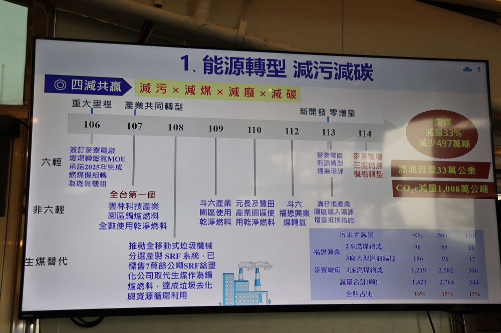 雲林縣環境保護局張喬維局長表示,雲林縣政府在空污防制過程中,除嚴格要求工廠依法管制,也同步輔導產業升級。自113年起推動低揮發性有機物塗料,至114年使用比例已達98%,有害氣體逸散削減率18%;另透過設備更新與製程優化,114年輔導減少揮發性有機物達254公噸。