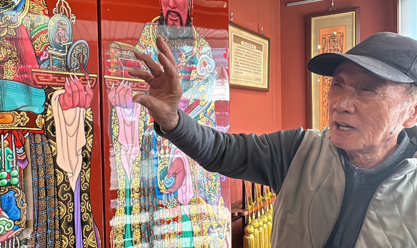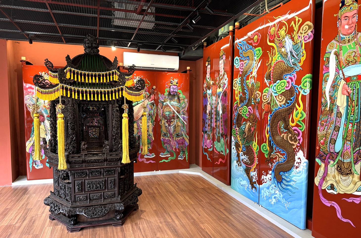 朝天宮首度為鎮宮之寶第一代與第二代祖媽轎打造專屬展示空間,並同步展出人間國寶洪平順的彩繪門神作品,為宗教文物保存與展演寫下新頁。(圖/記者蘇峯毅攝)