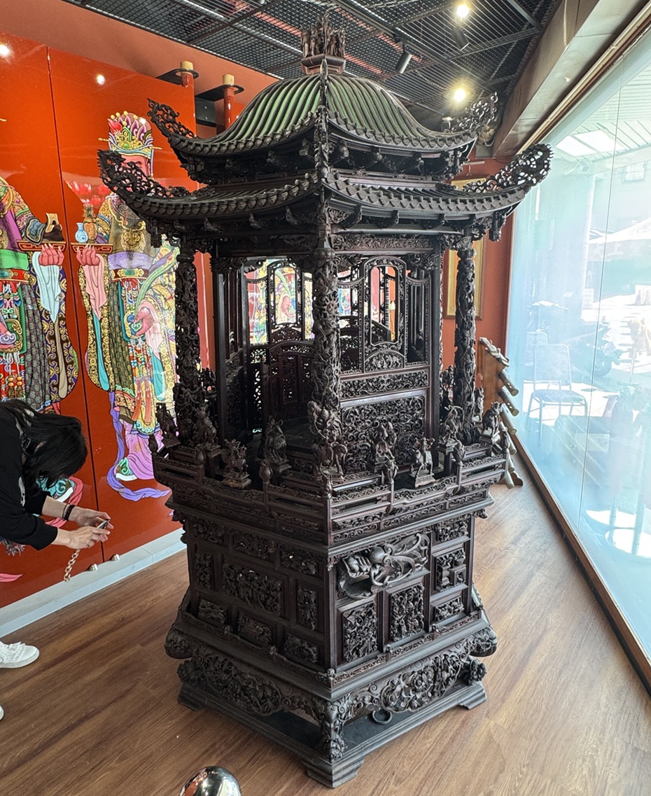舉世聞名的第一代與第二代木雕六角祖媽神轎,讓春節期間前來朝天宮上香祈福信眾可把握機會近距離參觀拍照。(圖/記者蘇峯毅攝)