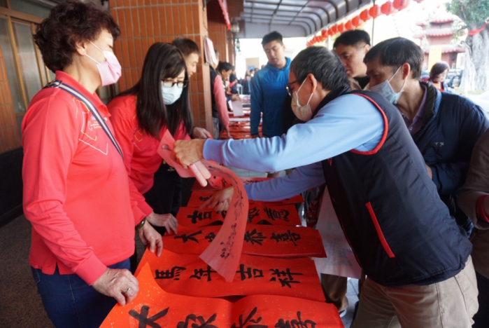 董事長的初中同學、萬和宮書法班老師張茂樹,每年都很熱心支持這項活動,今年仍然與學員一起揮毫,寫了數百幅春聯及「大家恭喜」、「春」、「滿」「招財進寶」等吉祥字。