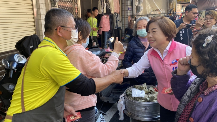 楊瓊瓔一早抵達后里市場,市場內人潮湧現,不少民眾停下腳步與她握手、合影,氣氛熱絡。攤商紛紛送上象徵好兆頭的菜頭、青蒜、鳳梨與發粿,寓意「好彩頭」、「凍蒜」、「旺來」與「步步高升」,傳遞滿滿祝福。多位支持者更高喊「凍蒜」、「加油」,也有人比出OK手勢表達唯一支持。
